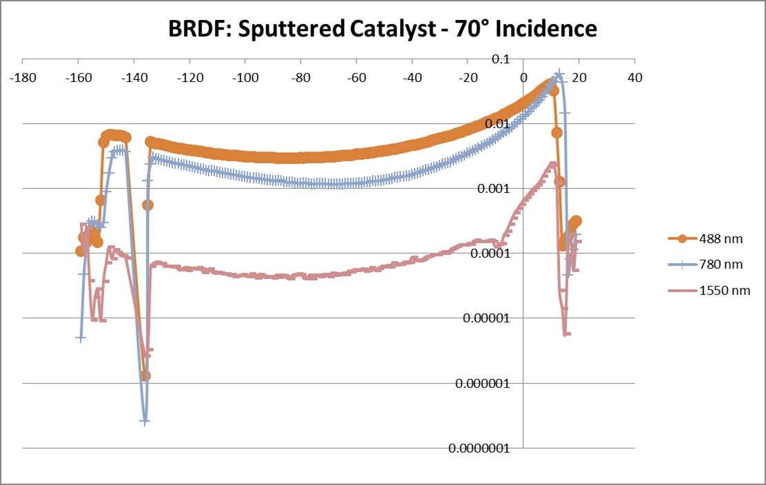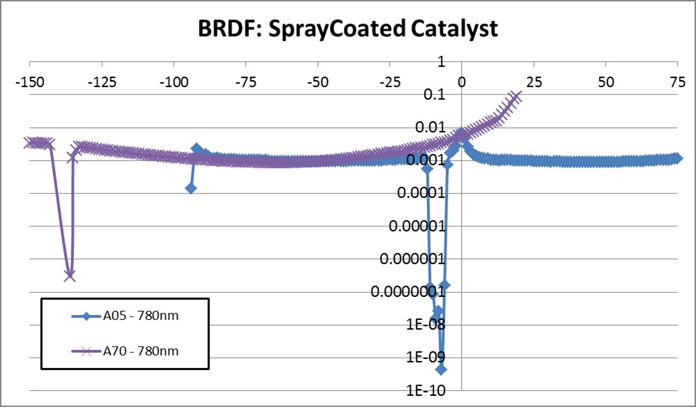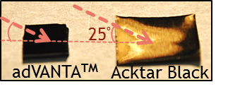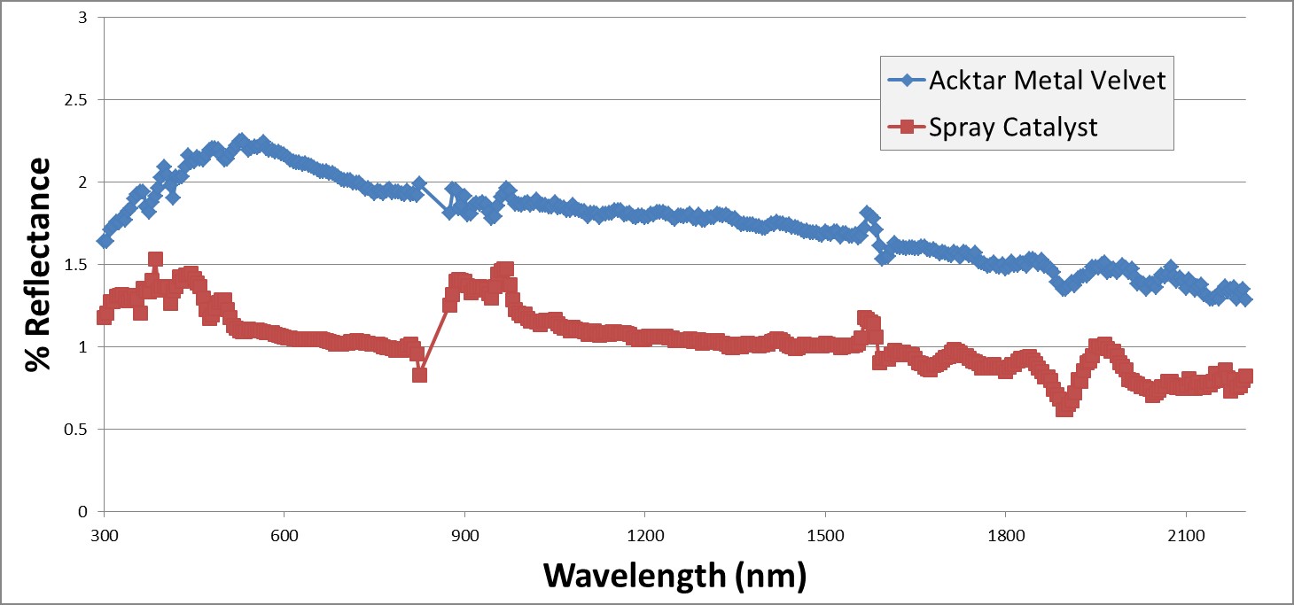 adVANTATM Black: What are its Properties? adVANTA has world class performance in the visible, NIR and IR (<1% reflectance from 250nm to 25 microns) exceeding the optical properties of other commercially available products like Acktar's metal velvet and Martin Black. It has passed multiple outgassing, vibration, thermal cycling and other tests to validate it for aerospace use. We have collected UV-VIS-NIR diffuse & spectral reflectance values BRDF data for these aligned arrays (aka forests or carpets). NanoLab has a proprietary spray catalysis and growth process that lets us create these coatings on your baffles, telescopes spars, and other optical parts. We have a full compliment of scratch & adhesion test data, along with vibration tests and outgassing rates. We also offer a 'repair kit' for scratched optical components to restore black coatings to <1% reflectance in the visible. All work is done domestically, by US citizens in an ITAR compliant facility. Call us to discuss custom work 781 609 2722. |