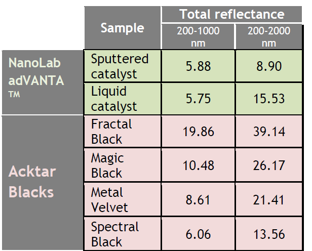adVANTATM Black: What is it? adVANTA is a vertically aligned nanotube array coating, having world class absorption across the UV, visible and infrared. It is used to coat optical components that must be non-reflective, absorbing and completely black across the visible and IR spectrum. This optical coating was developed under NASA support, (Phase II Small Business Innovative Research (SBIR) “Nanostructured Super-Black Optical Materials” (S2.02-8177)), along with a number of other materials and processes for the production of very high absorbance optical and infrared blacks. Our coating lab in Waltham, MA is equipped to deposit the VANTA coatings on customer parts. please email us with your requirements. NanoLab offers two products to meet the needs of optical engineers: |