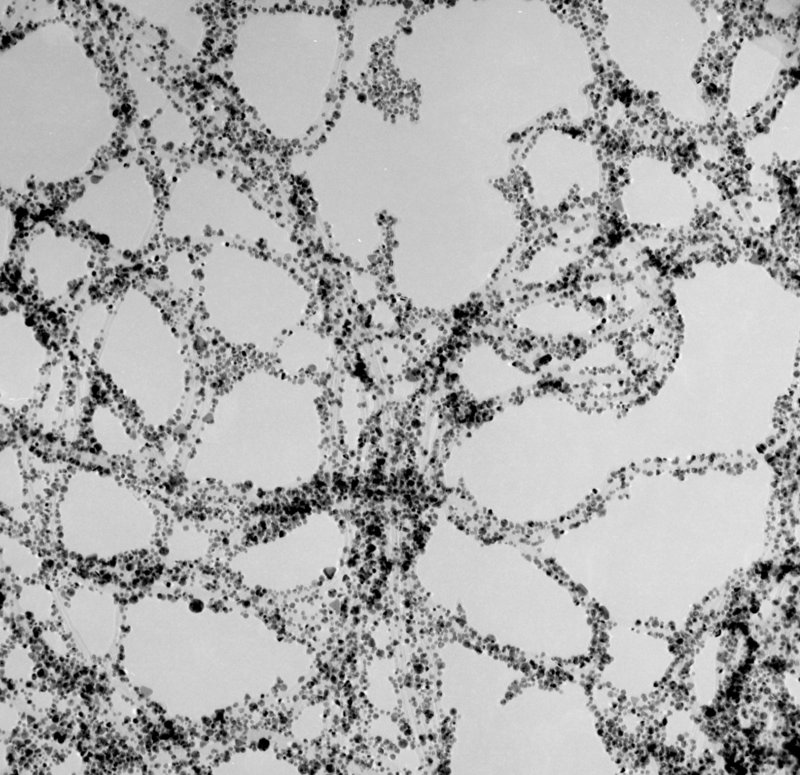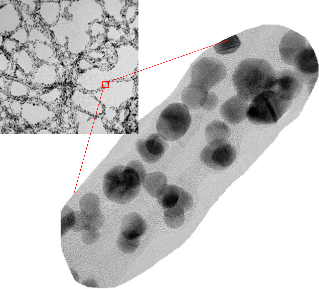 Gold nanoparticles (3 - 10nm) immobilized on carbon nanotubes. This is a demonstration of nanotube surface functionalization, which is one of the critical techniques responsible for widening the scope of nanotube applications, such as in optic-electronics and biosensors.