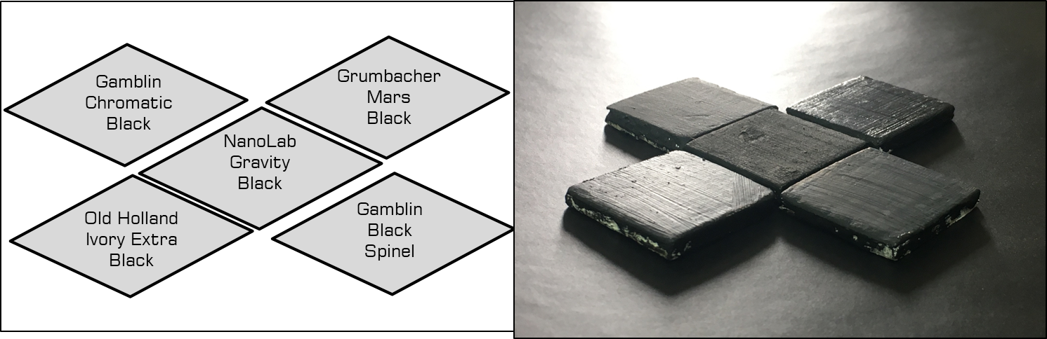 GravityTM Black, Is it glossy or matte? From a painter’s perspective, Gravity Black is the most color neutral paint we have seen. It can be blended with other single pigment paints without causing a hue change. With respect to glare, Gravity produces an extremely matte, non-reflective finish, as shown below. It is available here, and in select Artist & Craftsman stores.