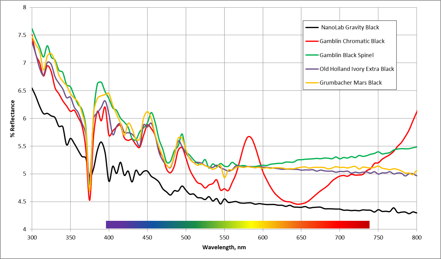 GravityTM Black, How Black is it? Gravity Black has a lower reflectance and is more featureless across the optical spectrum than other paints. In the plot below, Gravity’s spectrum is compared to other high end black oil paints.