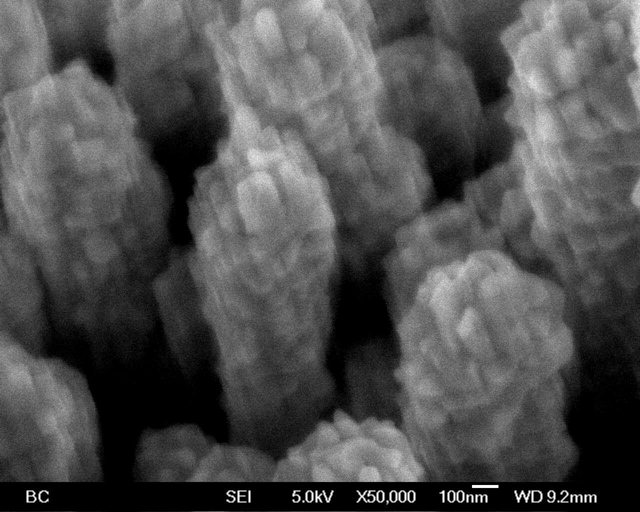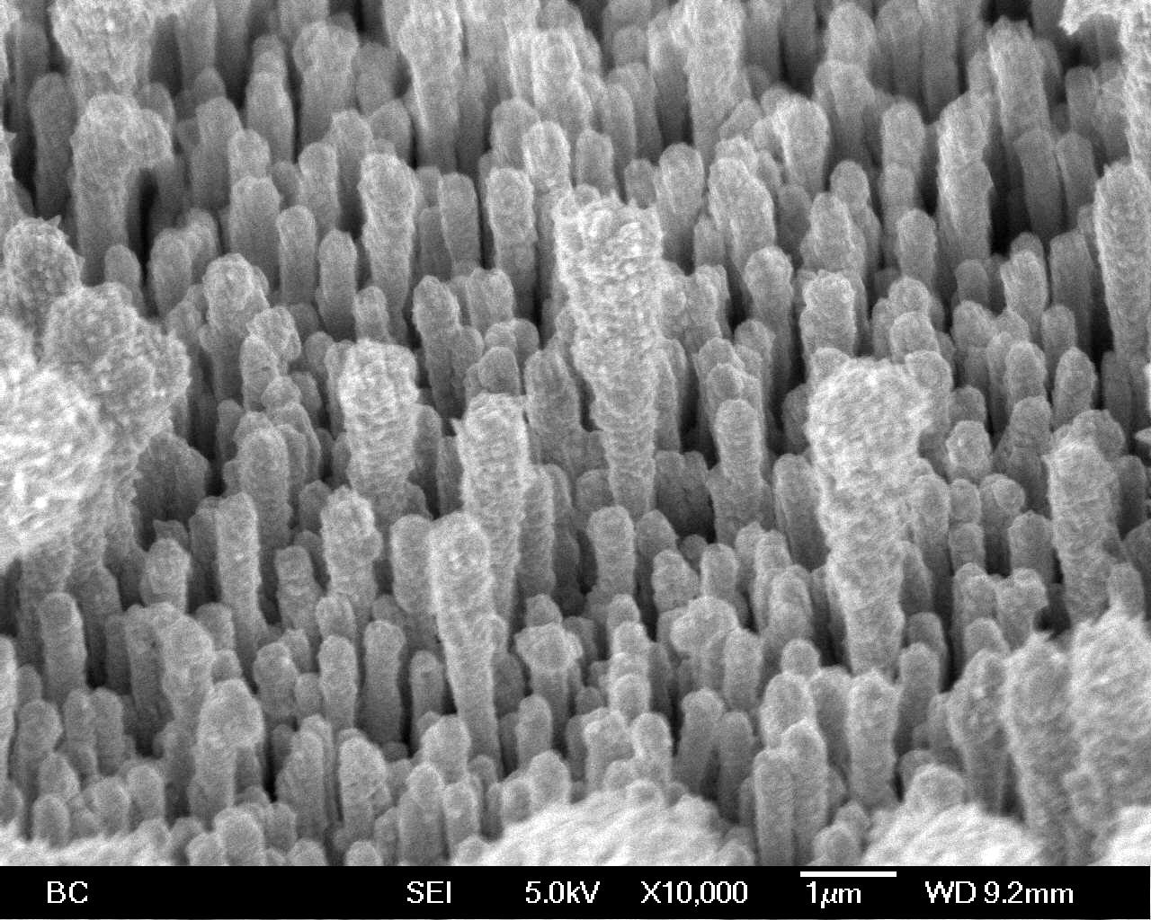 Above, a carbon nanotube has been coated with silver. Note that nanotubes are bent by the weight of the Ag, but are not broken. Scale bar = 1 micron.