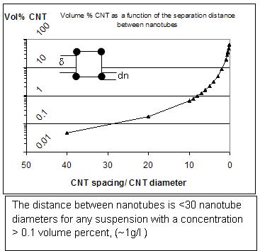 The volumetric ratio R for nanotubes of this aspect ratio is 4x10-5 vol%, which is less than 1 milligram per liter! (see Ref 1) At any greater concentration, the nanotubes will intrude upon each other’s hydrodynamic spheres and hinder rotation. This is the primary reason that nanotube paint or suspensions are difficult to make and build viscosity quickly.