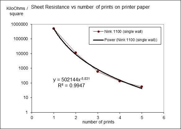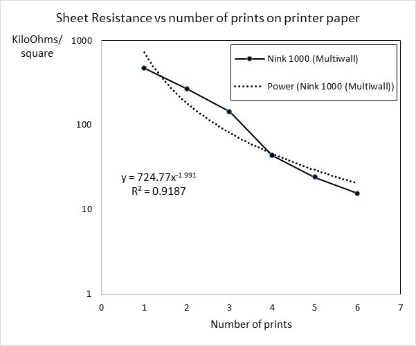 The resistance of the carbon nanotube deposit printed on both the paper is plotted against the number of printing times. On paper, the first printing results in a deposit that is below the percolation threshold. Electrical resistance drops with the number of additional prints, as the layer of nanotubes increases in thickness. Depending on the printer uniformity, fine features may become blurred by multiple prints.