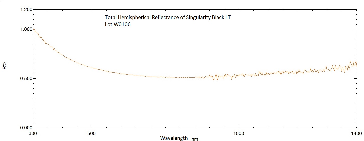 has a total hemispherical reflectance THR <1% in the visible (parts coated in our facility get a coating guarantee of sub 1% at 600nm) and <1.5% in the near infrared. On highly textured surfaces, we can make coatings that are even more absorbing across this range.